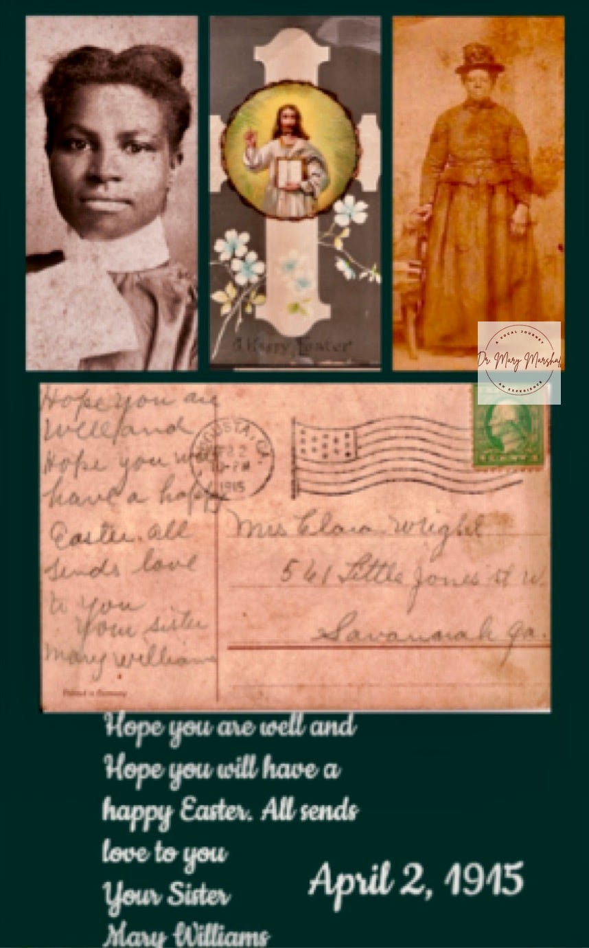 Great grandmother’s intent to celebrate Easter is evident in a postcard she wrote to her sister, Clara Wright. Given her joy as expressed on the postcard, her love of family, and skill as a seamstress, I think she designed and sewed lovely outfits for her husband, five daughters, and herself.